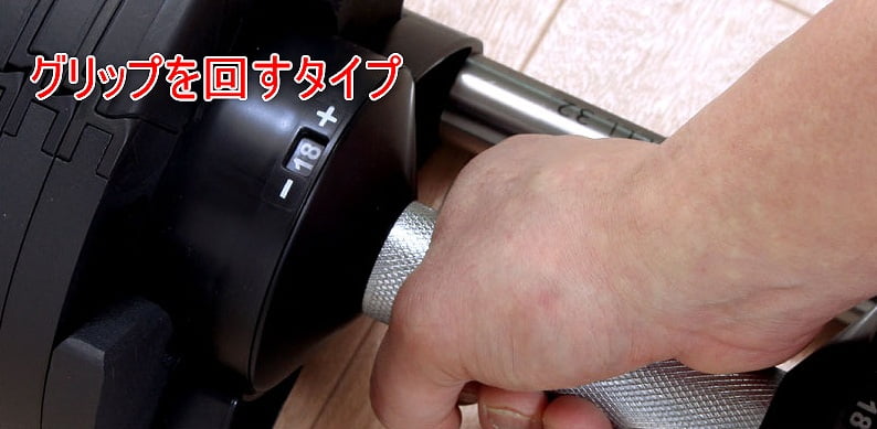 回転させる部分はダンベルによって異なっていて、グリップやダンベルの横のダイヤルを回すものが主流。