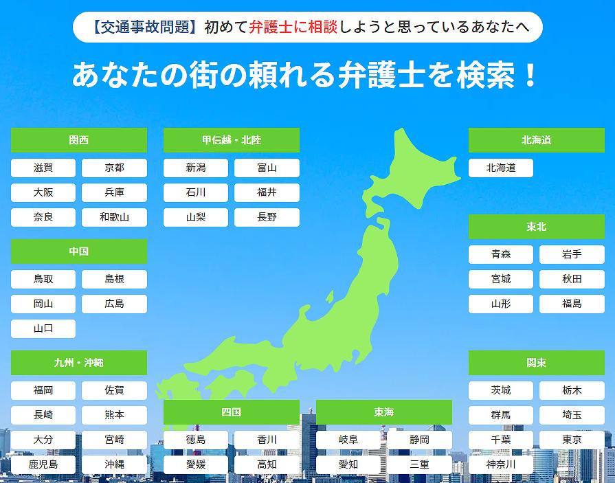 住んでいる都道府県を選択すれば、すぐに無料相談可能な交通事故専門の弁護士を検索することができます。