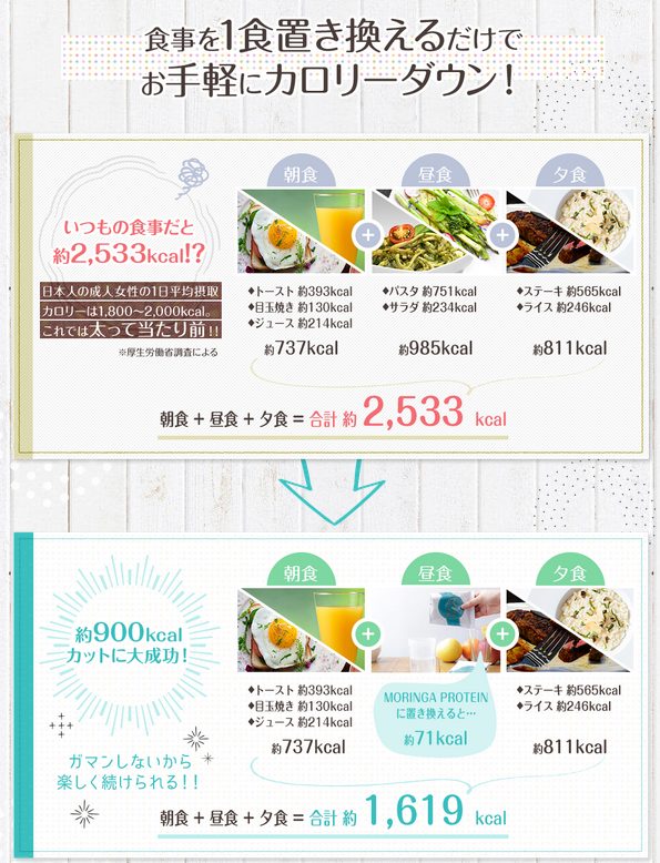 直接的なダイエット効果というよりは、1回の食事をモリンガプロテインに置き換えることで、満足感を得られつつ摂取カロリーを抑えることができるイメージで考えるといいですね!